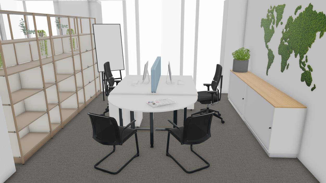 - ein 3er-Teamoffice mit ergonomisch perfektionierten Arbeitsplätzen, ausgestattet mit höhenverstellbaren Tischen aus unserer HV.O Premium-Serie